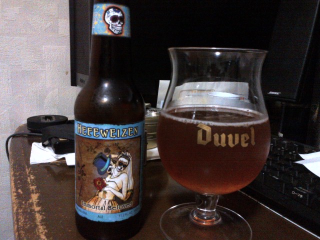 つまり、これだ。 昨日に引き続き、「CERVEZA DE LOS MUERTOS」……つまり「死者の日」の名を冠する、メキシコ発のクラフトビールである。 何というかもう、見れば見るほど奇怪なセンスだ。 くすんだ背景に、ガイコツ「風」に仮装した花嫁と花婿の姿。(あるいは、彼らは本当にガイコツなのであろうか?) ギャグのような、そうでないようなラベルのデザインは、見る者を当惑させ、そして「奇抜」を通り越した何かをひしひしと感じさせる。 少なくとも、この感性は日本人では有り得ないし、この国の審査基準で鑑みるならば、逆立ちしたって出来っこないラベルだ。 ビールの話に移ろう。 昨日はIPA=インディアン・ペールエールという、少々アクの強いモノを相手にしたわけだが、今日のこいつはまた違うベクトルで個性を持っている。 こいつは、Hefeweizen=ヘーフェヴァイツェン(=白ビール)なのだ。 このタイプのビールを口にするのは、ひょっとすると初めてかなぁ……。デュベルやオルヴァルあたりが、もしかすると似た傾向あるのかも知らんけど。 因みにウィキっていただければ解ることだが、白ビールといってもドイツ系とベルギー系と二種類あって、ベルギー系は基本的にスパイスや甘味料が入っている。 対するドイツ系白ビールは、子細に渡って確認したわけじゃないが、多分混ぜ物の類は入っていないだろうな。 そもそもドイツという国自体が、余りビール+添加物をヨロシクしないお国柄だからだ(大体ビール純粋令のせいだ)。 ともかく、ドイツ名の「ヘーフェヴァイツェン」を名乗るからには、このビールもまた、原材料は、麦芽とホップしか使っていないのだ。 下馬評では、苦くないビールでフルーティな香味がして、バナナやらクローブの香りがうんたらかんたらとあるようだ。 飲んでみれば確かに、果実のような華やかな香りと、物腰柔らかな甘い後味。 それもベルギー系みたいな、少しべたつく感じの甘味じゃなくて、ふわりと中から湧き上がってサッと掻き消える感じの、自然な甘さ。 誰でもウェルカムな感じで、非常に優しい味だ。調子に乗って、何杯でもスイスイ飲めてしまうような感じがする。 この味、どっかで飲んだことがある気がするんだよなー。……うん、ずっと考えているのだけれど、どうにも思い出せない。 何か甘さが、”ベジータベータ”っぽいんだよね。完全にフルーツって訳じゃなくて、少しニンジンらしさというか、若干の土臭さを感じるんだ。 うーん不思議。これはIPAとは、本当にもうハッキリ言って別物(そりゃもう、当たり前なんだけどね)。 いいですね。皆を集めてパーティなんかをする時でも、こう最初の一杯で、気軽に栓を抜いて皆にご馳走できるような、そんな懐の深さを感じるビールだ。 勿論、酒の好みは人それぞれ、という但し書きはあるんだが。 というわけで、「CERVEZA DE LOS MUERTOS HEFEWEIZEN」であった。 今回はこの辺で、さようなら。 |